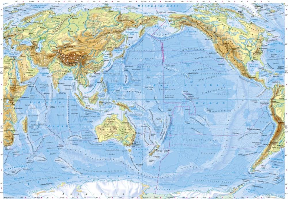 Der Pazifische Ozean ist der größte der drei Ozeane und stellt beinahe 50 Prozent der Wasserfläche der Erde dar. Der größte Teil des Pazifischen Ozeans ist mehr als 4 000 Meter tief; in den schmalen, langgezogenen Tiefseegräben werden sogar bis zu 11 034 Meter (im Marianengraben: Witjastief 1) erreicht. Die langgezogenen, schmalen Tiefseegräben markieren Grenzen zwischen Platten (z. B. zwischen der Pazifischen und der Philippinischen Platte, vgl. 256.2).
